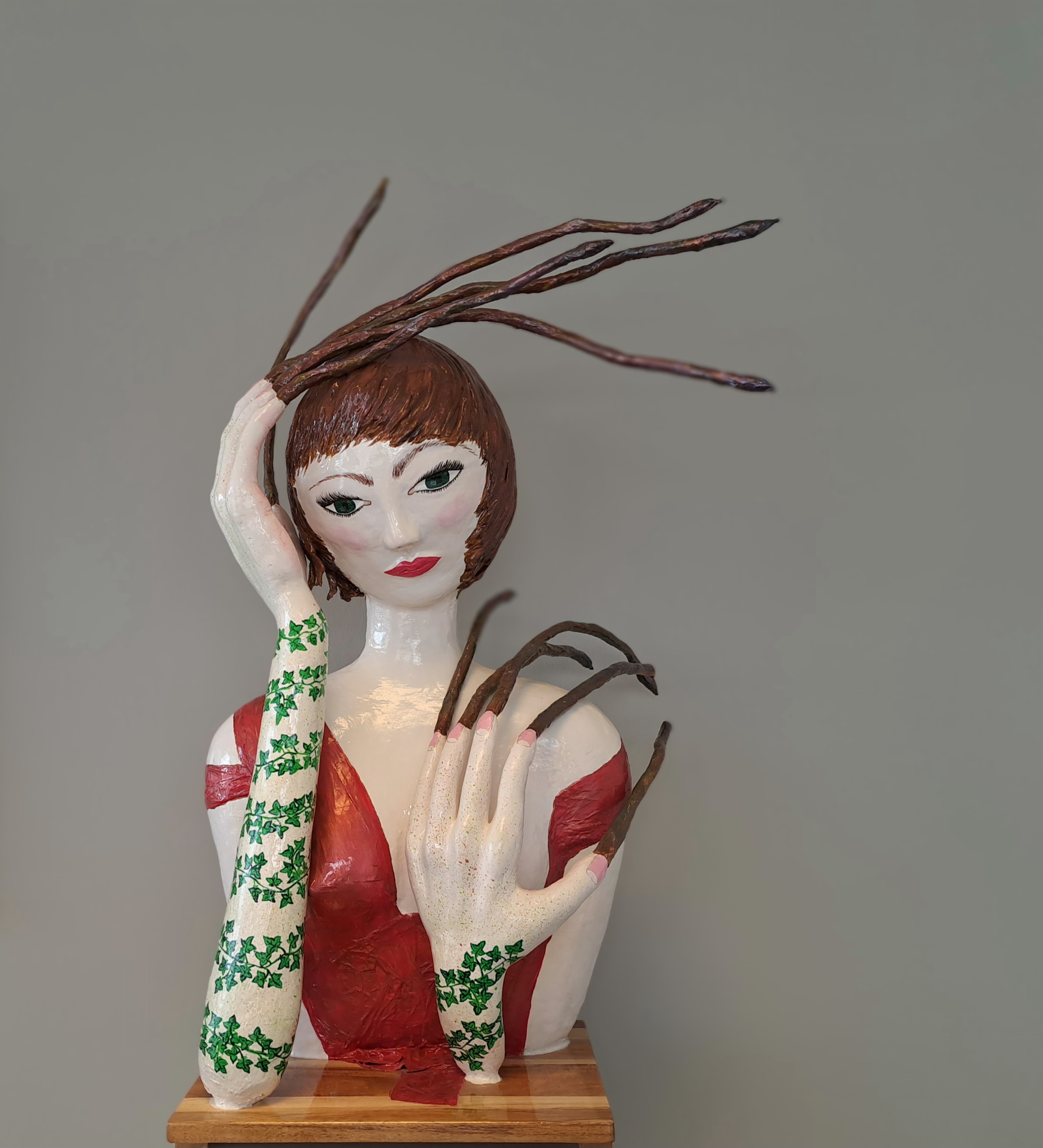 In warme aardetinten, levendig groen en dieprood beschilderd, belichaamt ze de harmonie tussen natuur en verlangen. De klimopmotieven op haar armen staan voor groei en vernieuwing, terwijl de organische vormen in haar haar haar verbondenheid tonen met het woud dat haar heeft gevormd.