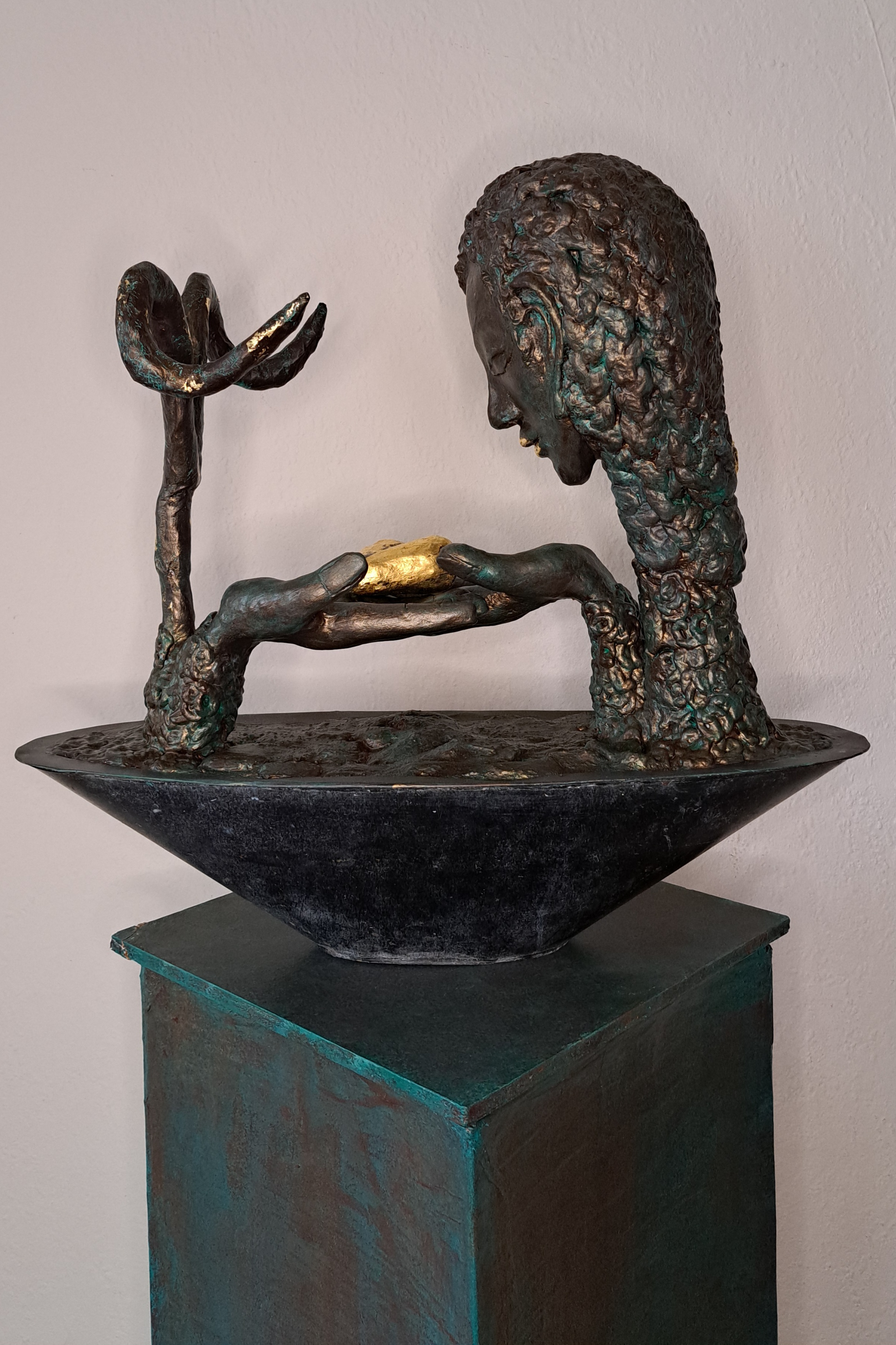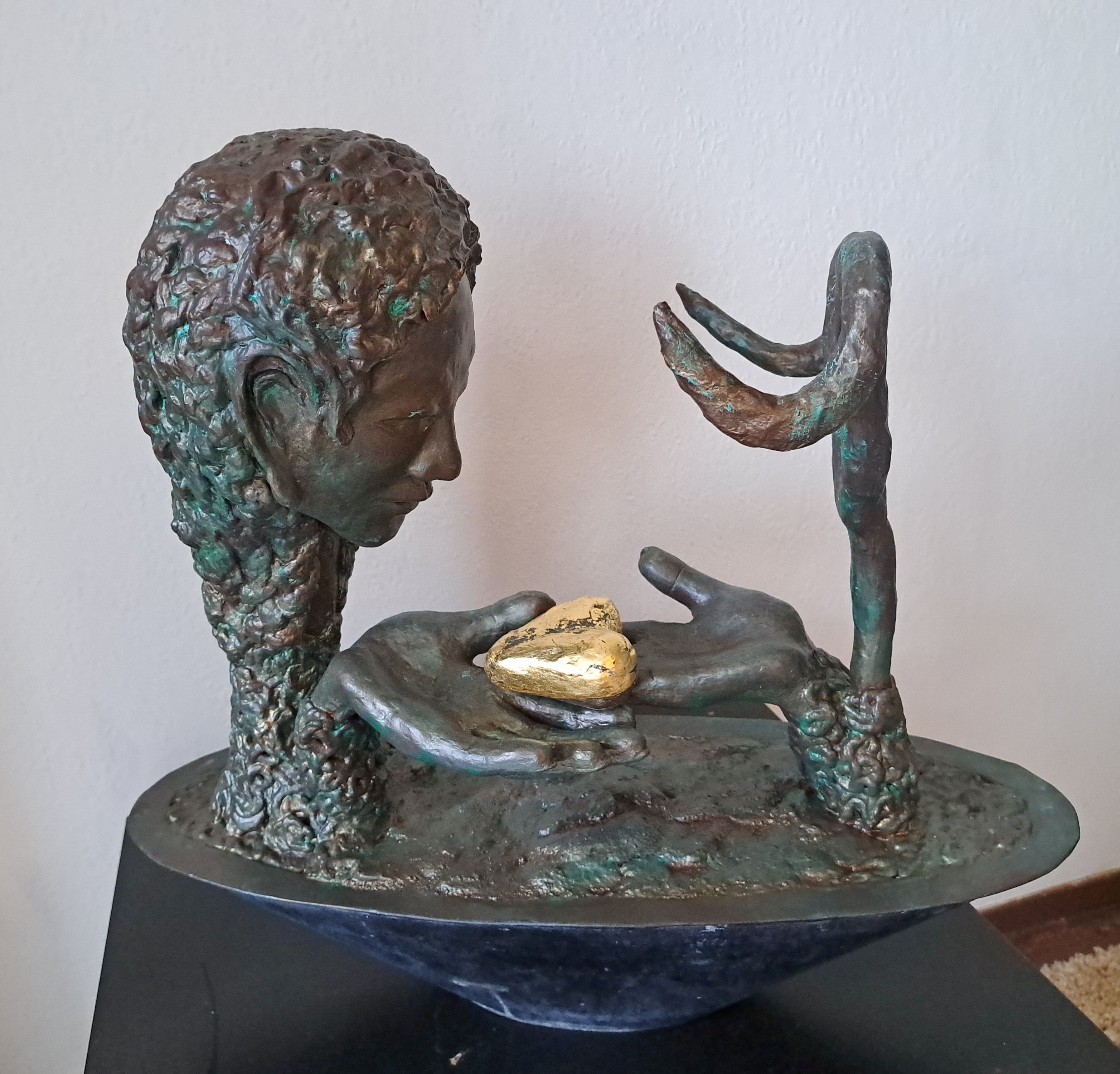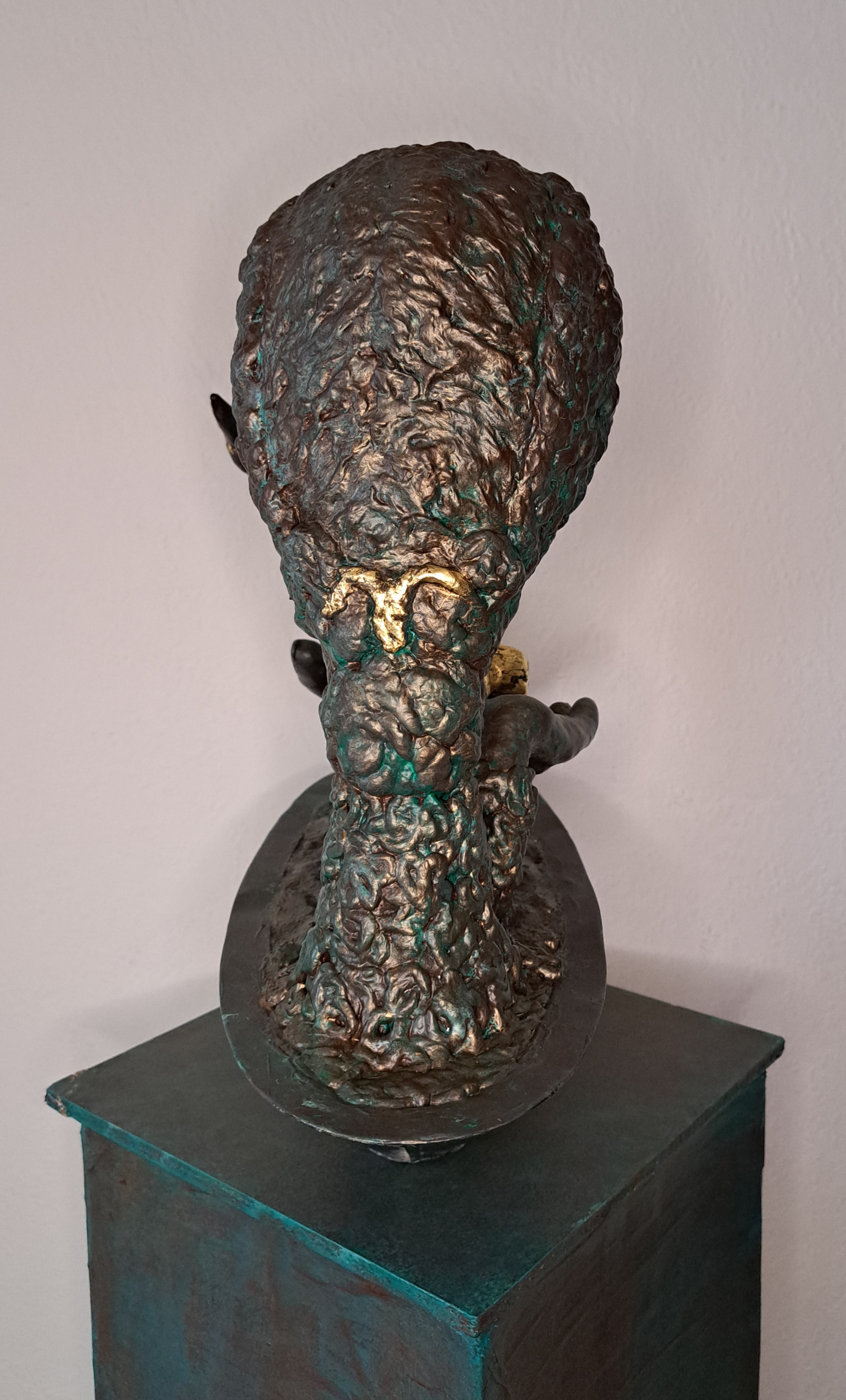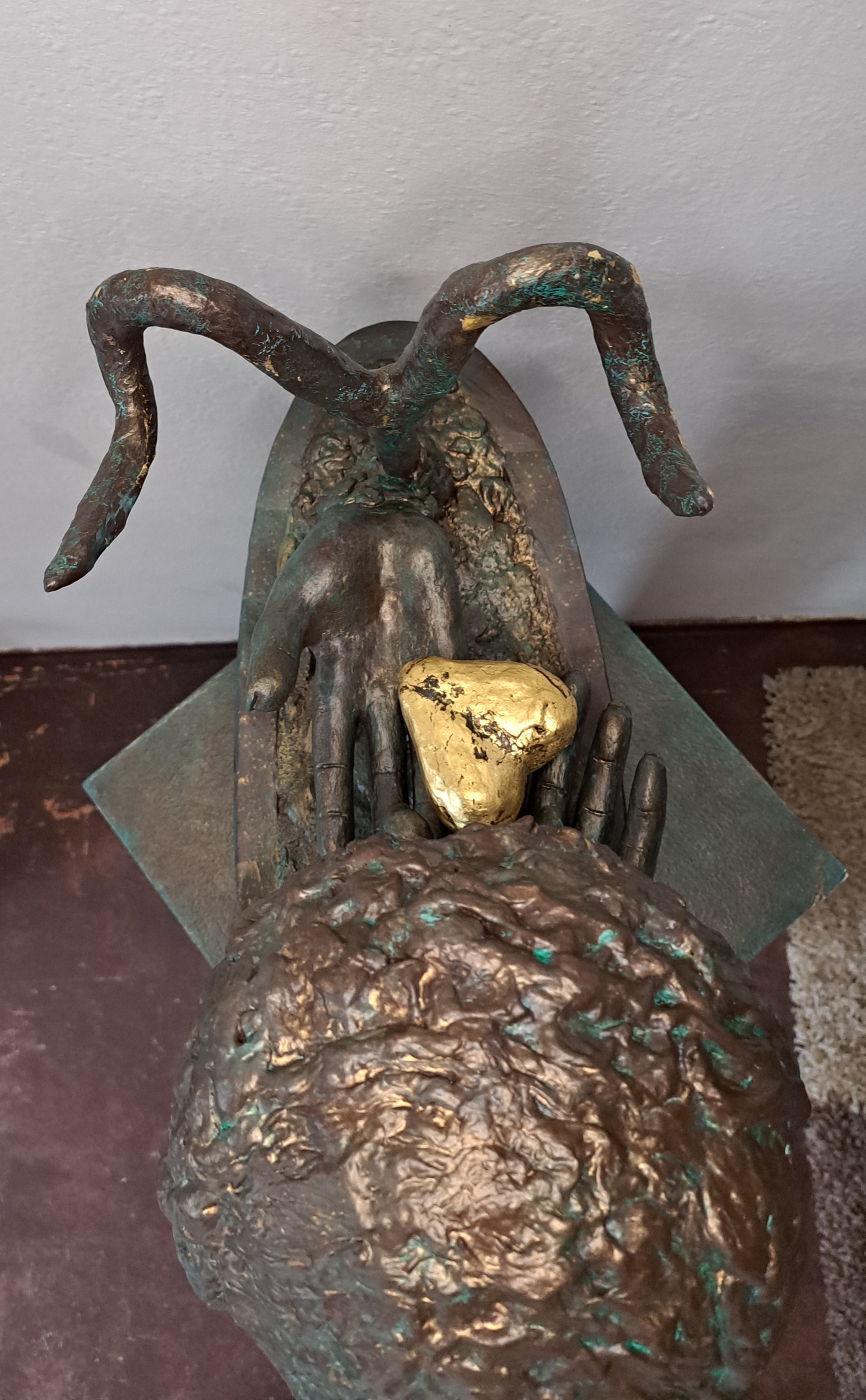 “Love Rock the Boat is opgebouwd uit papier-maché, papierpulp en gerecyclede materialen, beschilderd in faux bronze en verrijkt met bladgoud. Steentjes verzwaren het beeld, terwijl een gevende en een ontvangende hand samen een hart van goud dragen. De ram voegt zich hierbij als symbool van kracht en vernieuwing: hij herinnert ons eraan dat liefde niet alleen zacht is, maar ook de moed heeft om beweging te brengen en nieuwe wegen te openen.”